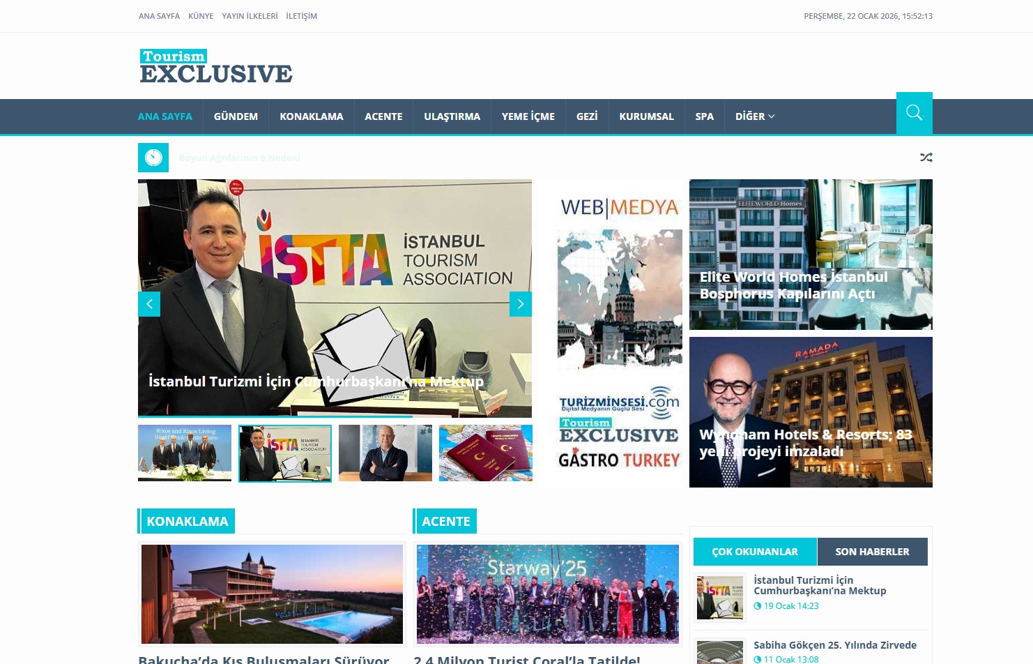 Türkiye’deki en güncel haberlere ve turizm sektörüne dair gelişmelere erişim kolaylığı sunan Tourismexclusive.com, seyahat, otelcilik, tatil trendleri ve turizm yatırımları alanında yayınladığı içeriklerle öne çıkan güçlü bir dijital platformdur. Güncel haberler, sektörel analizler ve özel dosya içerikleri sayesinde turizm profesyonelleri ve seyahat tutkunları için önemli bir bilgi kaynağıdır. Sürekli güncellenen yapısı ve kullanıcı dostu arayüzü ile Tourismexclusive.com, ziyaretçilerine hızlı ve güvenilir bir içerik deneyimi sunar.